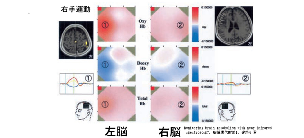 脳や神経の損傷箇所の血流は、運動療法や外部刺激デバイスなどを用いた刺激によって増加することが科学的に証明されています(下図参照)。