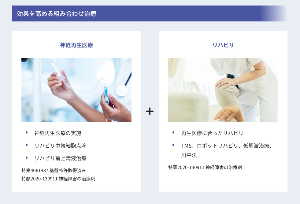 リハビリ中のサイトカイン治療(点滴、鼻腔吸入)は、神経再生医療の効果を高める。